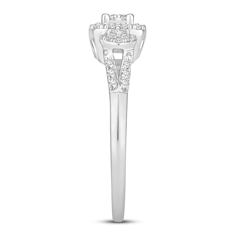 A beautiful princess-cut diamond shines at the center of this classic diamond engagement ring for her. The ring features two more princess-cut diamonds on either side of the center, all haloed by sparkling round-cut diamonds. More round-cut diamonds flow down each side of the 10K white gold band, bringing the total diamond weight to 3/8 carat. From the Now & Forever® bridal collection.