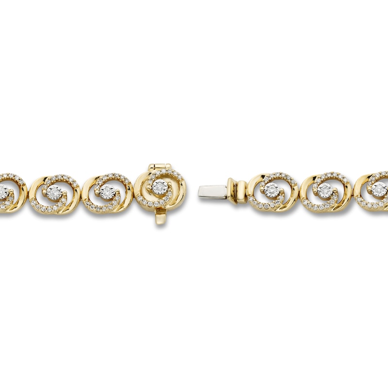 This gorgeous diamond line bracelet from the Encircled by Love™ collection features a repeating pattern of interlocking circles graced by a center diamond, to serve as a reminder that they're always surrounded by your love. Brilliant round-cut diamonds embellish the 10K yellow gold links for a total diamond weight of 1 carat. The 7.25-inch bracelet secures with a tongue clasp.