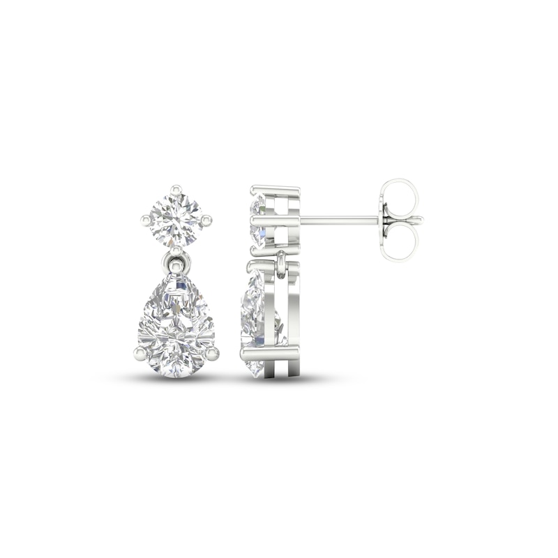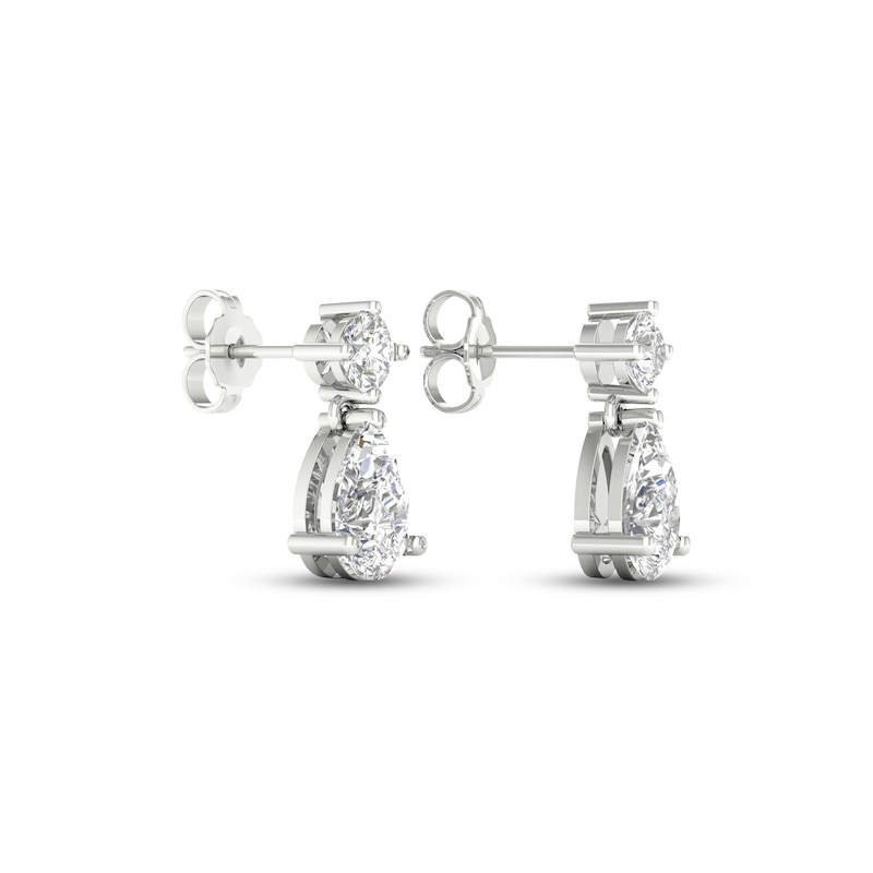 These sensational earrings feature a round diamond shining at the post, from which dangles a dazzling pear-shaped diamond. Crafted in iconic 14K white gold, the earrings have a total diamond weight of 2 1/2 carats.