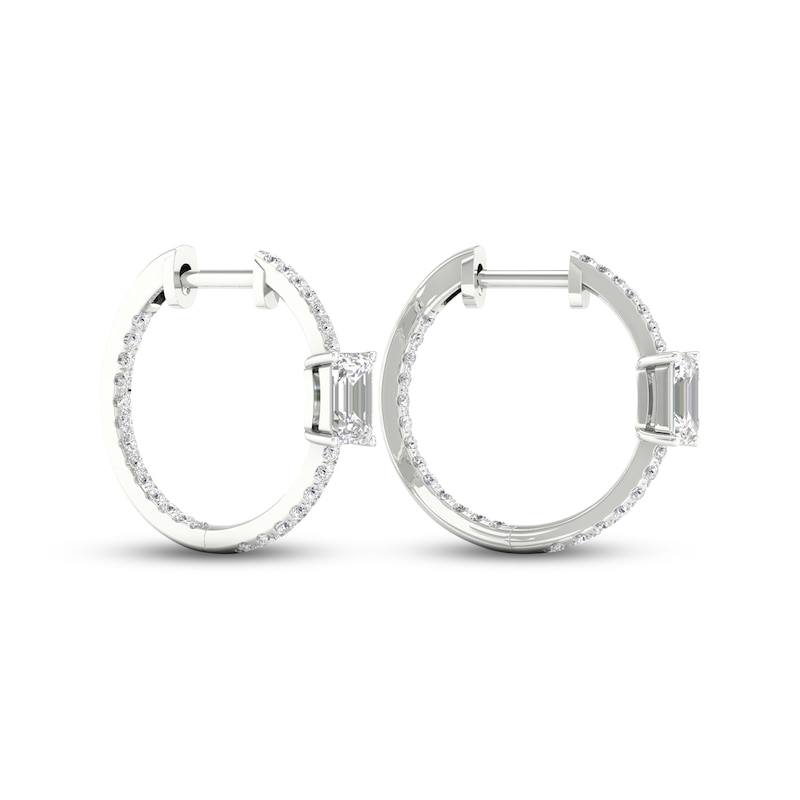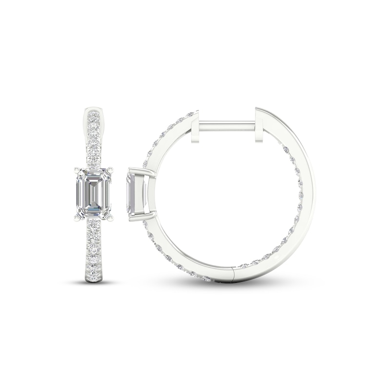 Irresistibly radiant, these gorgeous huggie hoop earrings showcase a glittering emerald-cut diamond. Round diamond sweep down the 14K white gold setting, giving the pair a total diamond weight of 1 carat. The earrings secure with hinged backs.