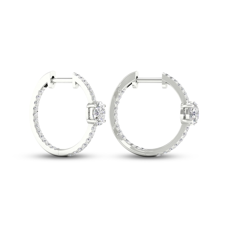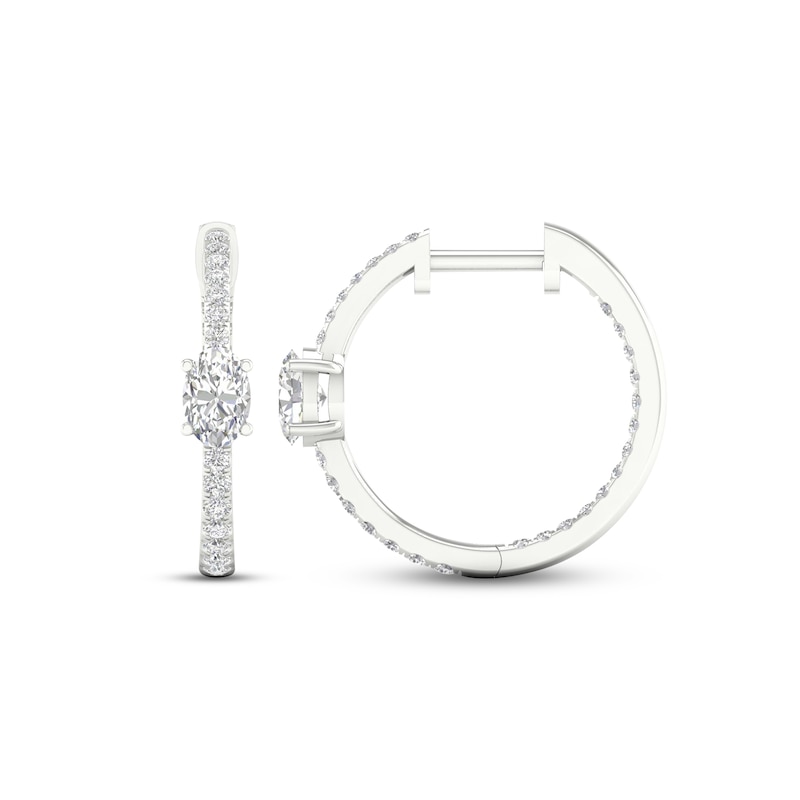 These scintillating huggie hoop earrings showcase a sparkling oval-cut diamond. Round diamonds sweep down the 14K white gold setting, giving the pair a total diamond weight of 1 carat. The earrings secure with hinged backs.