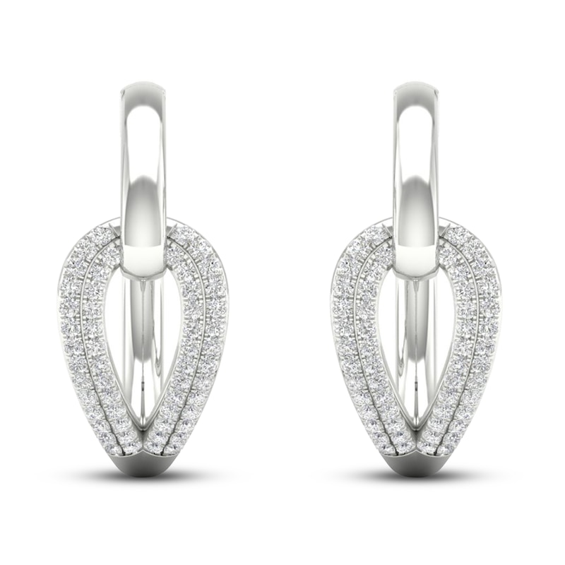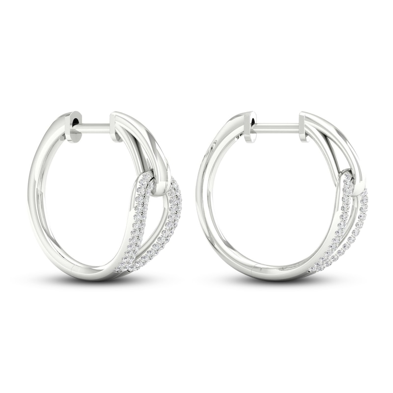 These beautiful hoop earrings from the Love + Be Loved™ collection feature a gorgeous interlocking link design, symbolizing the inseparable bond two people share. Sparkling round-cut diamonds embellish the hoops for a total diamond weight of 1/4 carat. The earrings are crafted in chic 10K white gold and secure with hinged backs.