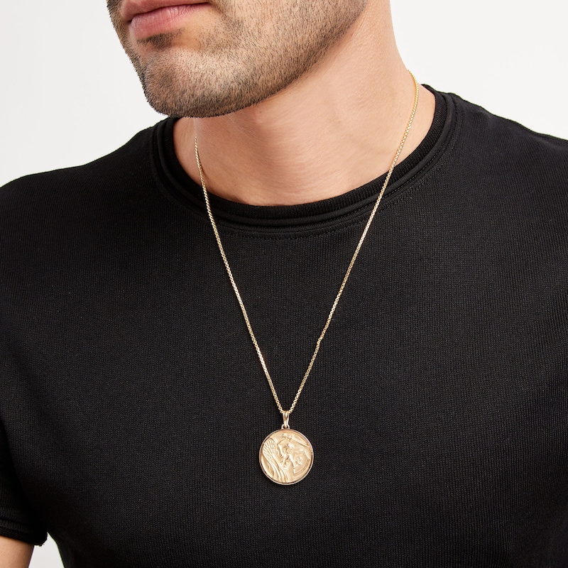 Summon strength and courage with this radiant necklace styled in 10K yellow gold. The medallion features a relief depiction of a warrior angel wielding a sword. The pendant sways from a 22-inch box chain that secures with a lobster clasp.