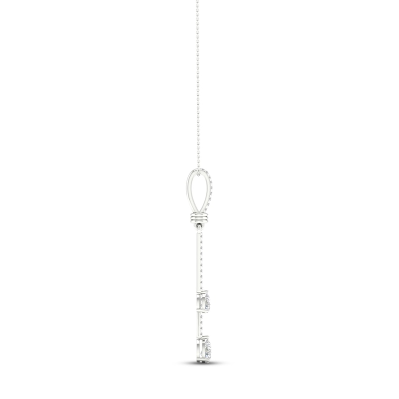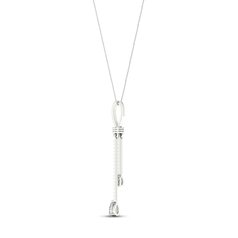 This stunning drop necklace features two staggered strands of radiant round-cut diamonds, each punctuated by a shimmering pear-shaped diamond. More round diamonds shine on the bail for added allure, giving the 14K white gold necklace a total diamond weight of 1/2 carat. The pendant sways from an 18-inch cable chain that secures with a lobster clasp.