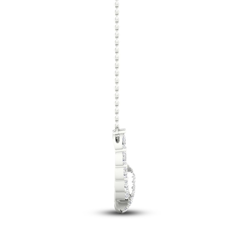 Look radiant in this ravishing diamond necklace styled in 14K white gold. A curving sweep of luminous round-cut diamonds crosses over a top row of marquise-cut diamonds and a bottom row of pear-shaped diamonds. Boasting brilliant sparkle throughout, the pendant has a total diamond weight of 2 1/4 carats and suspends from a sleek cable chain. The necklace measures 18 inches and fastens securely with a lobster clasp.
