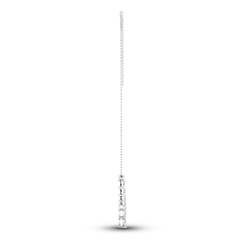 This splendid necklace features a curving row of brilliant round diamonds shining above a sparkling V design of pear-shaped diamonds. Exquisitely crafted in 14K white gold, the necklace has a total diamond weight of 2 carats. The double-row pendant suspends from an 18-inch cable chain that fastens securely with a lobster clasp.