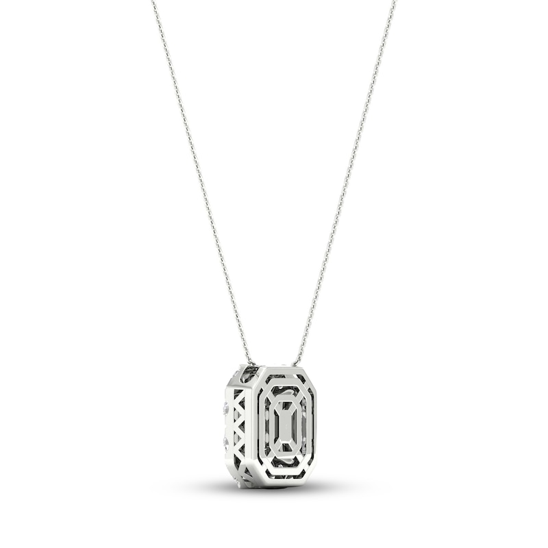 Entrancing and elegant, this necklace showcases a luxe 1-carat emerald-cut diamond framed in luminous round-cut diamonds. Fashioned in 14K white gold, the diamonds total 2 carats in weight. The pendant sways from an 18-inch cable chain that secures with a lobster clasp.