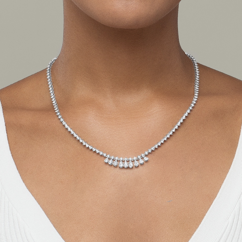 Radiant round diamonds line this magnificent Riviera necklace, styled in iconic 14K white gold. An array of graduating pear-shaped diamonds dangle from the center for added allure, bringing the total diamond weight to 10 carats. The 18-inch necklace secures with a snap-lock clasp.