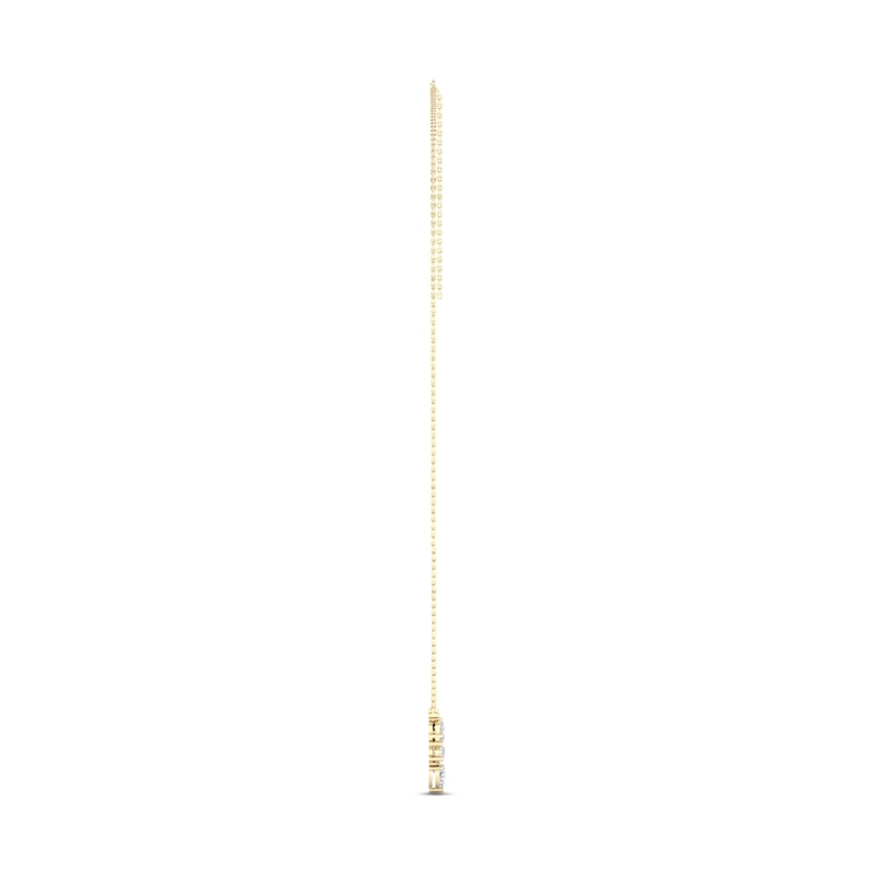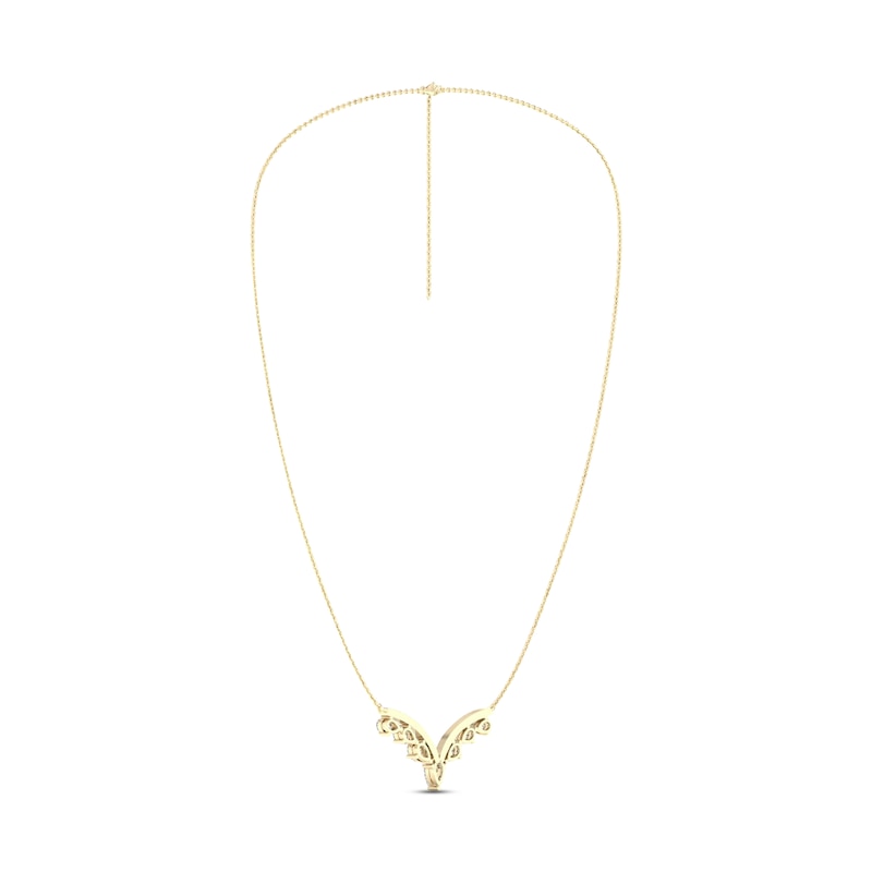 Pear-shaped diamonds sparkle in a beautiful chevron beneath sweeping curves of round-cut diamonds in this magnificent V necklace for her. Styled in timeless 14K yellow gold, the necklace has a total diamond weight of 1 1/2 carats. The pendant suspends from an 18-inch cable chain that secures with a lobster clasp.