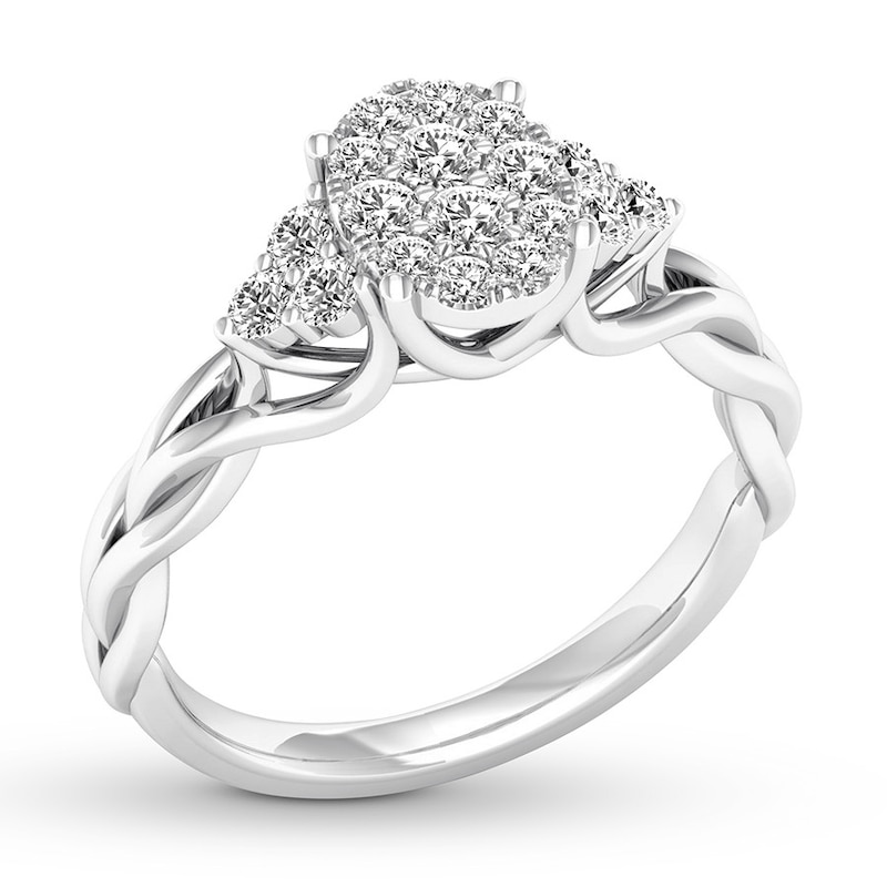 Begin the next chapter of your love story with this wonderful engagement ring. Sparkling arrays of round diamonds decorate geometric shapes in the center, while elegant twists of 14K white gold form the band. The ring has a total diamond weight of 1/2 carat.