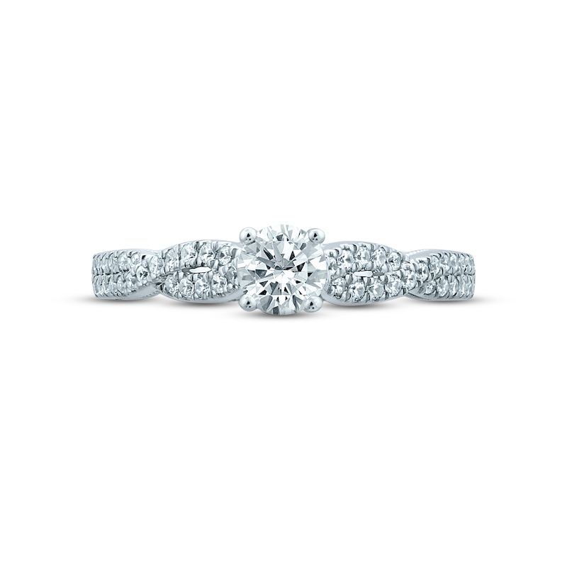 This dazzling engagement ring displays a 3/8-carat round diamond at the center. Radiant rows of round diamonds interweave along the elegantly twisted band, which is fashioned in iconic 14K white gold. The ring has a total diamond weight of 1/2 carat. From the Now and Forever® bridal collection.