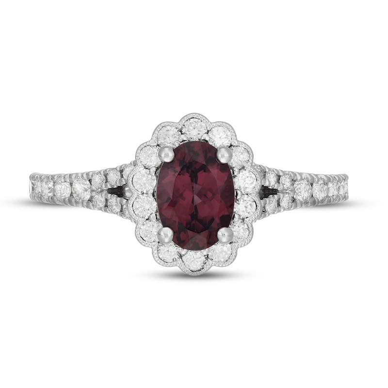 A romantic oval-cut rhodolite garnet shines at the center of this beautiful engagement ring for her. Radiant round diamonds halo the center and gracefully adorn the band. Crafted in 14K white gold, the ring has a total diamond weight of 5/8 carat. From the Neil Lane Bridal® collection.