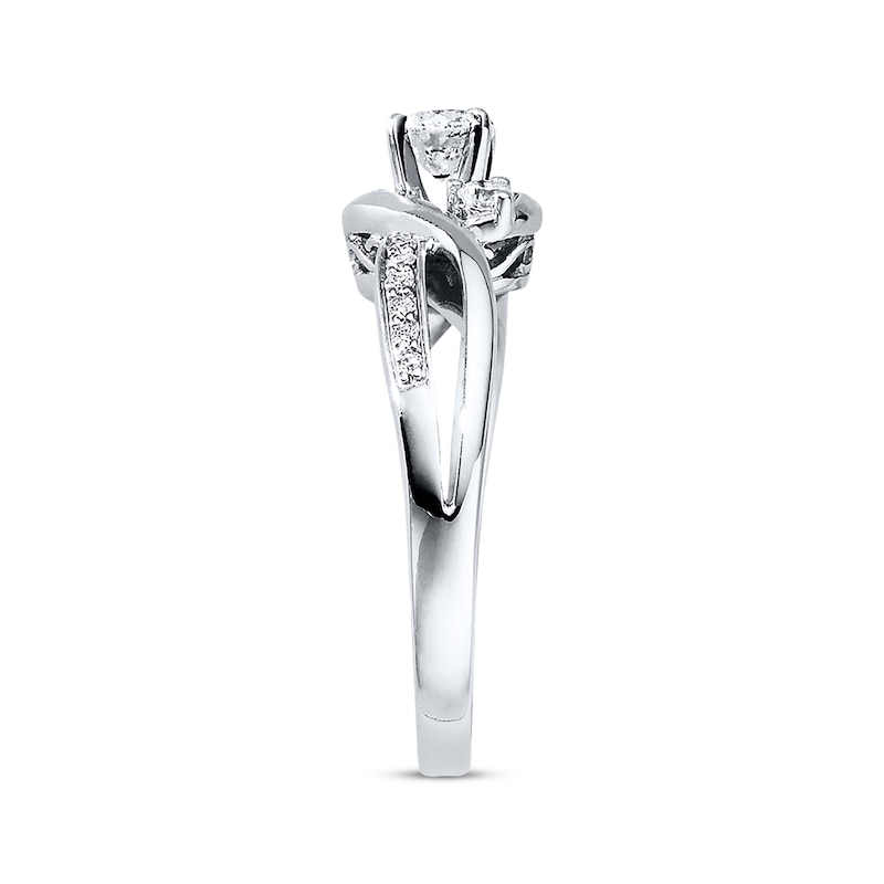 Three stunning round diamonds are embraced by sweeps of 14K white gold in this splendid engagement ring for her. Ribbons of additional round diamonds and 14K white gold flow along the band to complete the look. The ring has a total diamond weight of 3/8 carat.