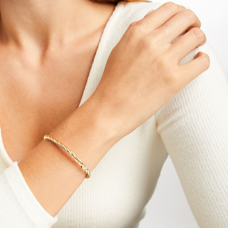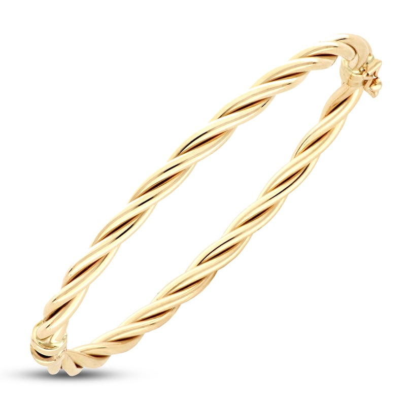 This chic bangle bracelet features a pretty braided design with three rows that twists around the length. The Italian-made bangle is crafted in iconic 14K yellow gold and secures with a hinge clasp.