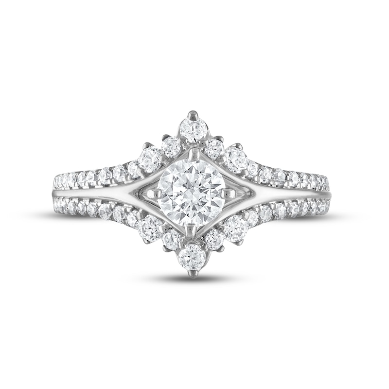 Elegant and enchanting, this engagement ring for her showcases a 1/2-carat round center diamond that sparkles between chevrons of cool 14K white gold. Shimmering round diamonds add allure to the edges and sweep down to adorn the band. The ring has a total diamond weight of 1 carat. From the Now and Forever® bridal collection.
