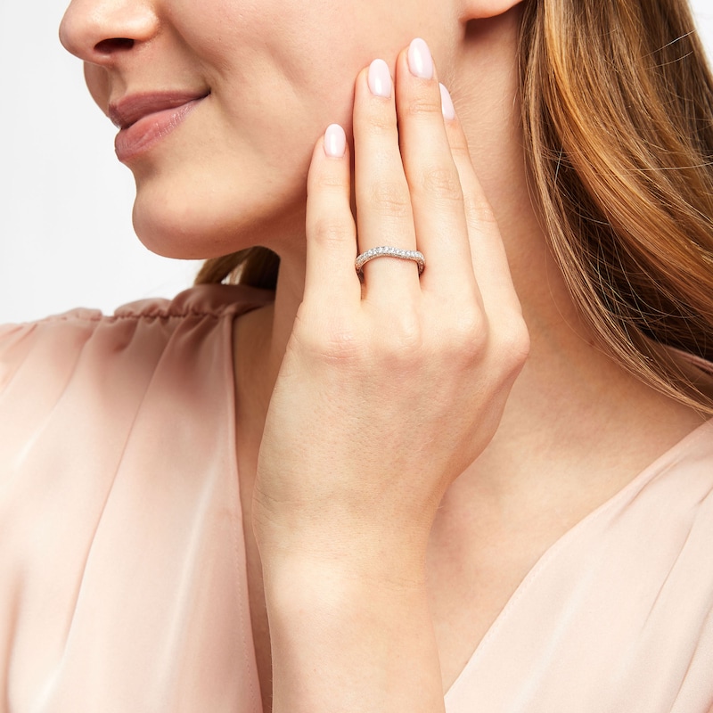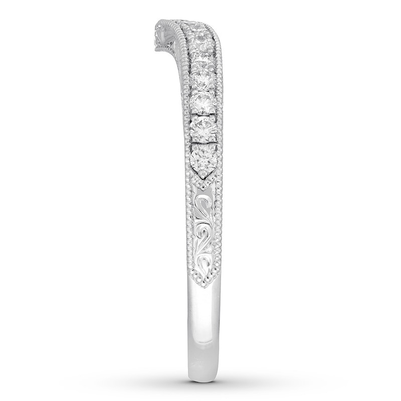 Sparkling round diamonds are edged in milgrain detail for subtle texture in this elegant Neil Lane Bridal® wedding band. Crafted of 14K white gold, the ring is contoured to fit alongside her matching engagement ring (sold separately). A flourishing design completes the look. The diamonds total 1/3 carat in weight.