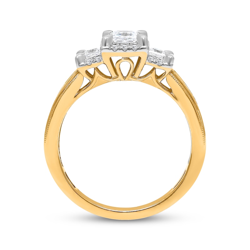 Three stunning princess-cut diamonds sparkle across this beautiful engagement ring, representing your past, present, and future. Each center diamond is haloed by round diamonds, and more round diamonds sparkle down the 14K yellow gold band. The ring has a total diamond weight of 1 carat, and classic milgrain detailing finishes the design. From the Now & Forever® bridal collection.