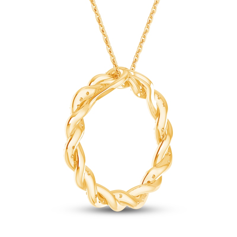 This stunning diamond necklace from the Circle of Gratitude® collection features a twisted circular design to serve as an expression of your enduring gratitude. Dual twisted ribbons of 10K yellow gold and brilliant round-cut diamonds weave around the pendant for a total diamond weight of 3/8 carat. The pendant is suspended from a 19-inch cable chain and secures with a trigger clasp.