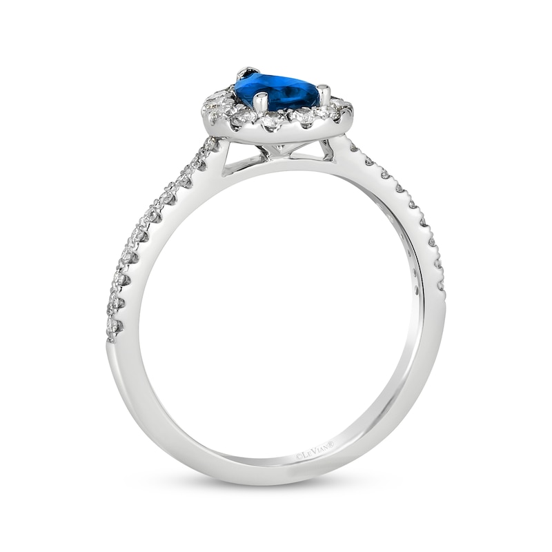 A wonderful gift to show your forever love, this striking ring features a breathtaking pear-shaped Cornflower Ceylon Sapphire™ that is poised inside dancing round Nude Diamonds™ that also grace the 14K Vanilla Gold® band. The ring has a total diamond weight of 3/8 carat. Le Vian®. Discover the Legend. This ring is available in limited sizes. If you don't see your size here, please visit a store to order your ring.
