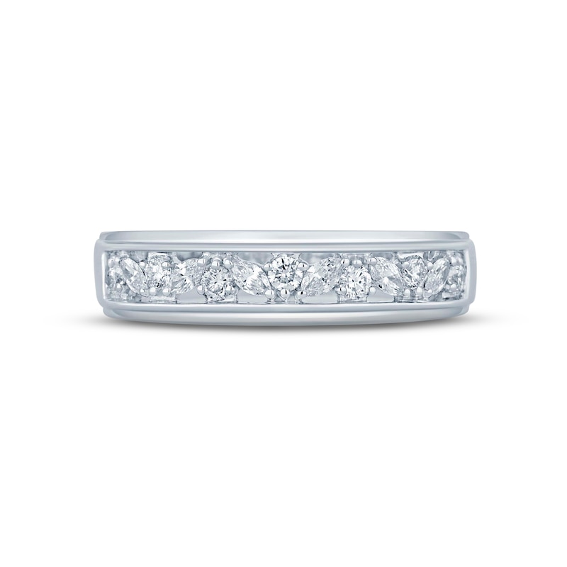 This magnificent wedding band is crafted in 18K white gold and features an alternating row of radiant round and marquise-cut diamonds. The ring has a total diamond weight of 1 1/2 carats, and the diamonds are independently certified. From the Monique Lhuillier Bliss collection, available exclusively at KAY. Please note: This ring is available in limited sizes. If you don't see your size here, please visit a store to order your ring.