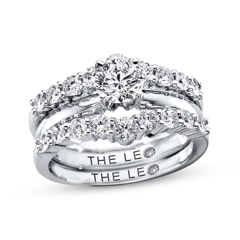 This thrilling enhancer ring for her sparkles with round diamonds above and below a space for her coordinating solitaire engagement ring (sold separately). This THE LEO Diamond® ring has a total diamond weight of 1 carat and is crafted of 14K white gold.