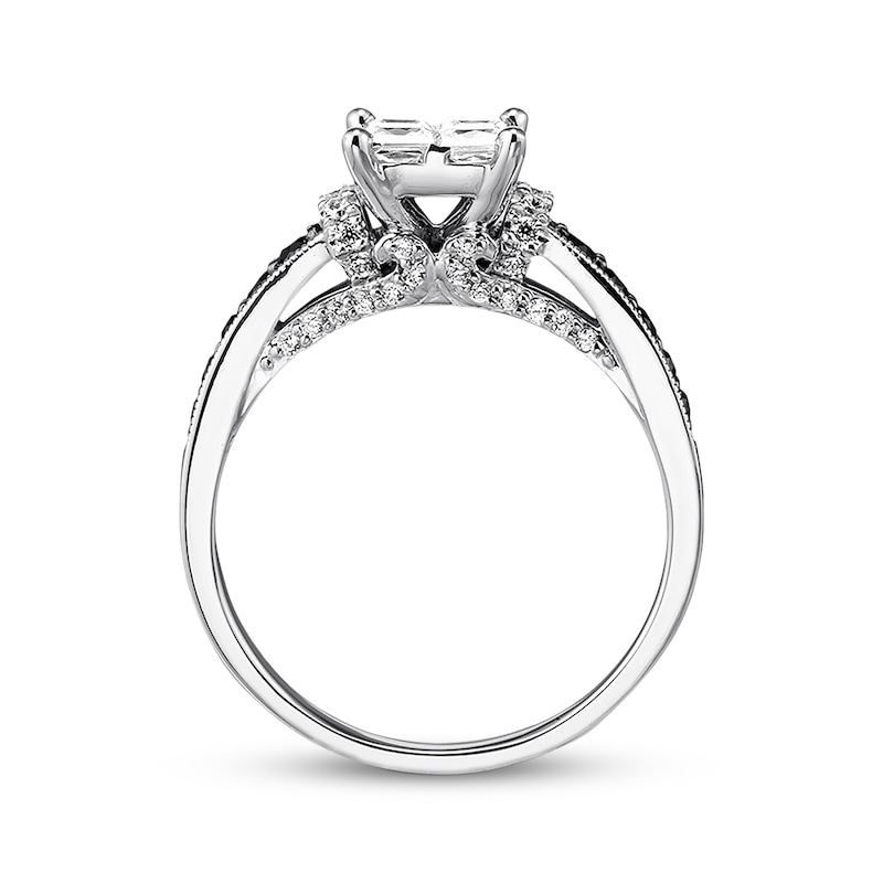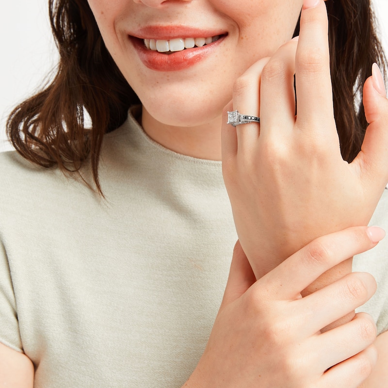A two-tone design and sparkling princess-cut diamonds make this engagement ring a modern masterpiece. Round diamonds shimmer on each side of the center, while black diamonds adorn the band to complement. Delicate milgrain detail adds the finishing touch. Crafted of 14K white gold, the ring has a total diamond weight of 1 carat. From the Now & Forever® Bridal Collection.