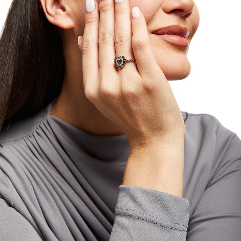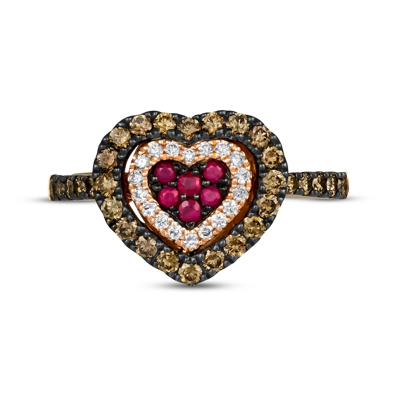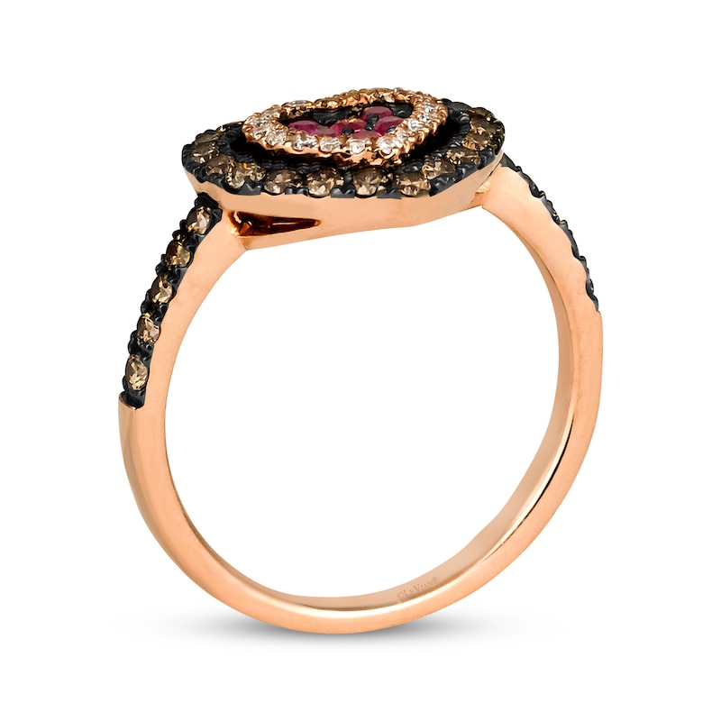 You can almost taste the decadent collaboration between GODIVA™ x LE VIAN® in this scrumptious ring. Crafted in 14K Strawberry Gold®, the dazzling heart ring is a chocolate lover’s dream with a sweet center of round-cut Passion Ruby™ stones—wrapped in a layer of Vanilla Diamonds® and an outside shell of Chocolate Diamonds®. More Chocolate Diamonds® line the shank for a total diamond weight of 5/8 carat. Le Vian®. Discover the Legend. This ring is available in limited sizes. If you don't see your size here, please visit a store to order your ring.