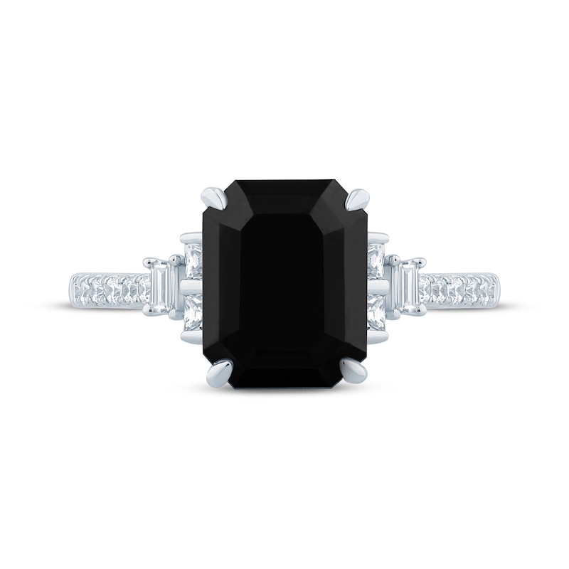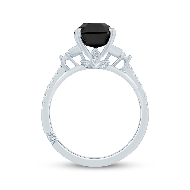 Thrill her with the alluring contrasts of this black and white diamond engagement ring. The striking style is crafted in 14K white gold. An exquisite 4-carat emerald-cut black diamond is flanked by princess and baguette-cut white diamonds. Ribbons of round-cut white diamonds decorate halfway down the shank. Round diamonds sparkle in a fleur-de-lis design at the bridge. A signature element of diamonds in milgrain detailing encircles the band, symbolizing unity and eternal love. The ring boasts an astounding total diamond weight of 4 1/3 carats. From the Monique Lhuillier Bliss collection, available exclusively at KAY. Please note: This ring is available in limited sizes. If you don't see your size here, please visit a store to order your ring.