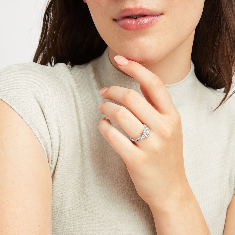 This engagement ring for her from the Neil Lane Bridal® collection shimmers with a brilliant round center diamond set in 14K white gold. Surrounding the center and lining the band are additional round diamonds, bringing the total diamond weight to 7/8 carat.