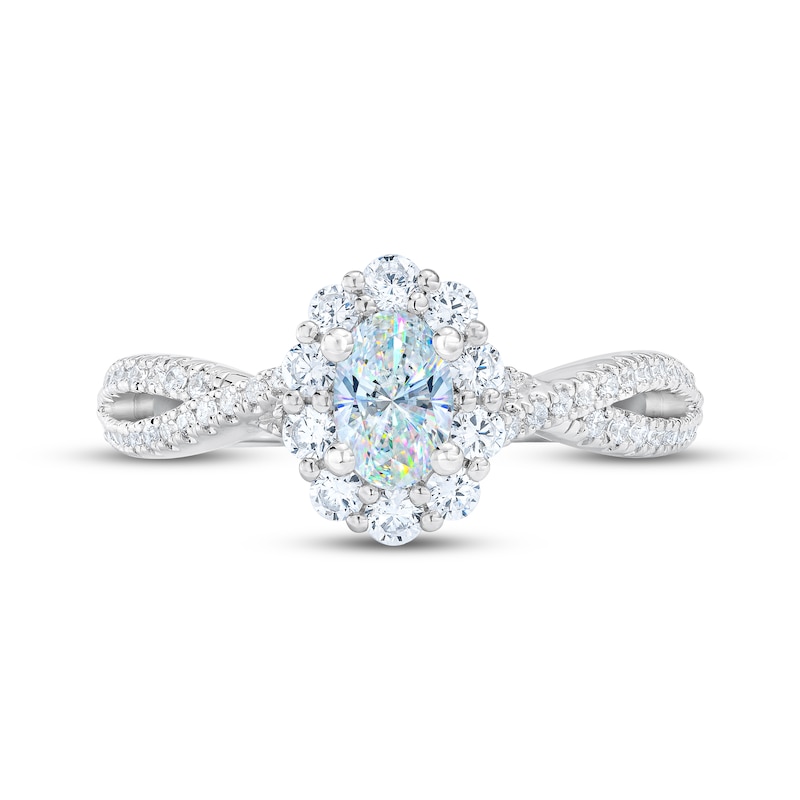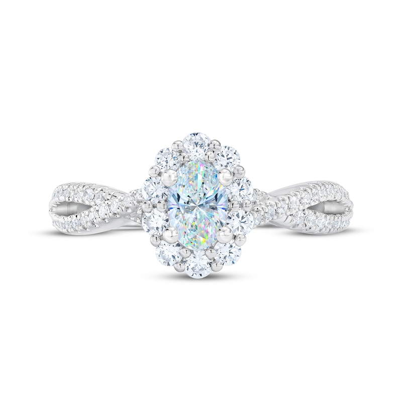 An entrancing 1/2-carat oval-cut First Light® diamond is the centerpiece of this resplendent engagement ring for her. From Leo Schachter, the independently-certified diamond features Fire Prism™ technology that creates infinite flashes of color for more fire and sparkle. Radiant round diamonds halo the center and adorn the twisting split-shank band. Styled in 14K white gold, the ring has a total diamond weight of 1 carat. The center diamond is inscribed with a unique Gemscribe® serial number to ensure your peace of mind. Live Your Love in Color.™