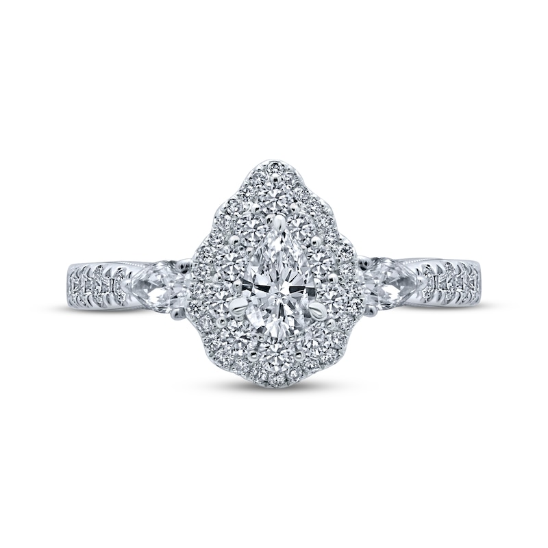 An array of sparkling round diamonds surround a center pear-shaped diamond in this stunning engagement ring. Additional pear-shaped diamonds dazzle on each side, and rows of round diamonds decorate the top and sides of the band. Styled in 18K white gold, the ring has a total diamond weight of 1 1/4 carats. From the Monique Lhuillier Bliss collection, available exclusively at KAY. Please note: This ring is available in limited sizes. If you don't see your size here, please visit a store to order your ring.