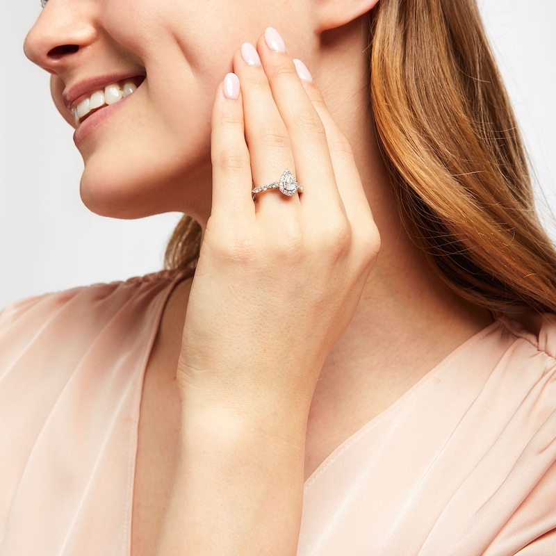 This enchanting engagement ring displays a 1/2-carat pear-shaped center diamond surrounded by dazzling round diamonds. Additional round diamonds cluster along the 18K white gold band, bringing the total diamond weight to 7/8 carat. From the Monique Lhuillier Bliss collection, available exclusively at KAY. Please note: This ring is available in limited sizes. If you don't see your size here, please visit a store to order your ring.