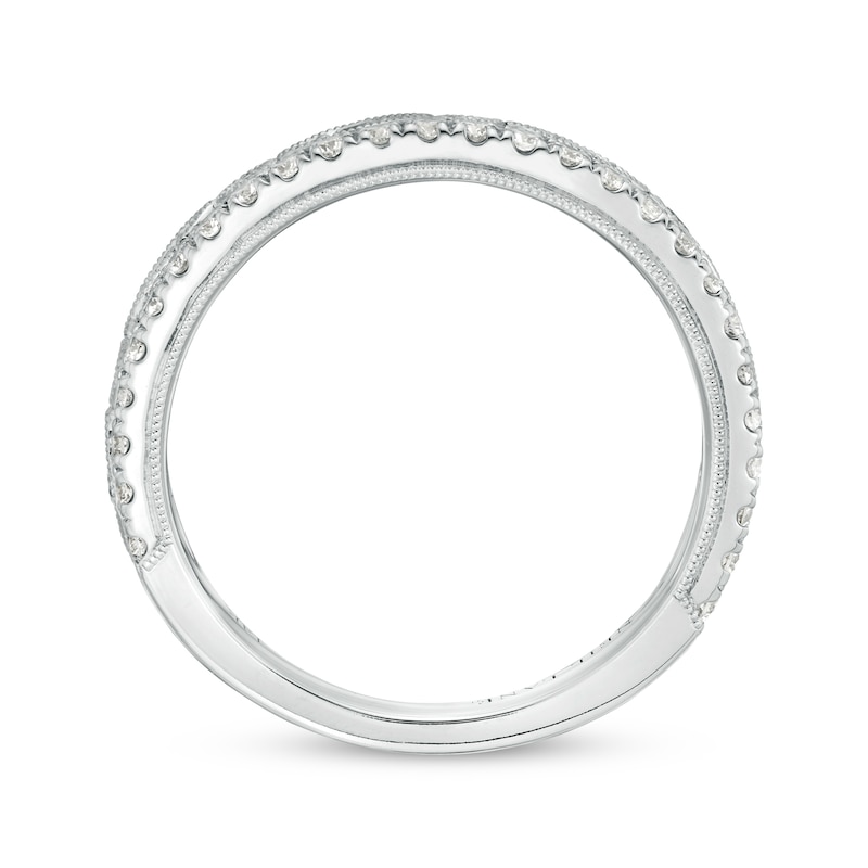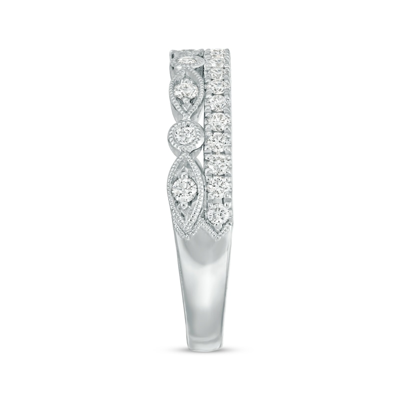 This vintage-inspired anniversary ring from Neil Lane Bridal® features a double row of diamonds set in classic 14K white gold. The top row is finished with milgrain detailing and unique bezel settings to complete the look. The ring has a total diamond weight of 1/2 carat.