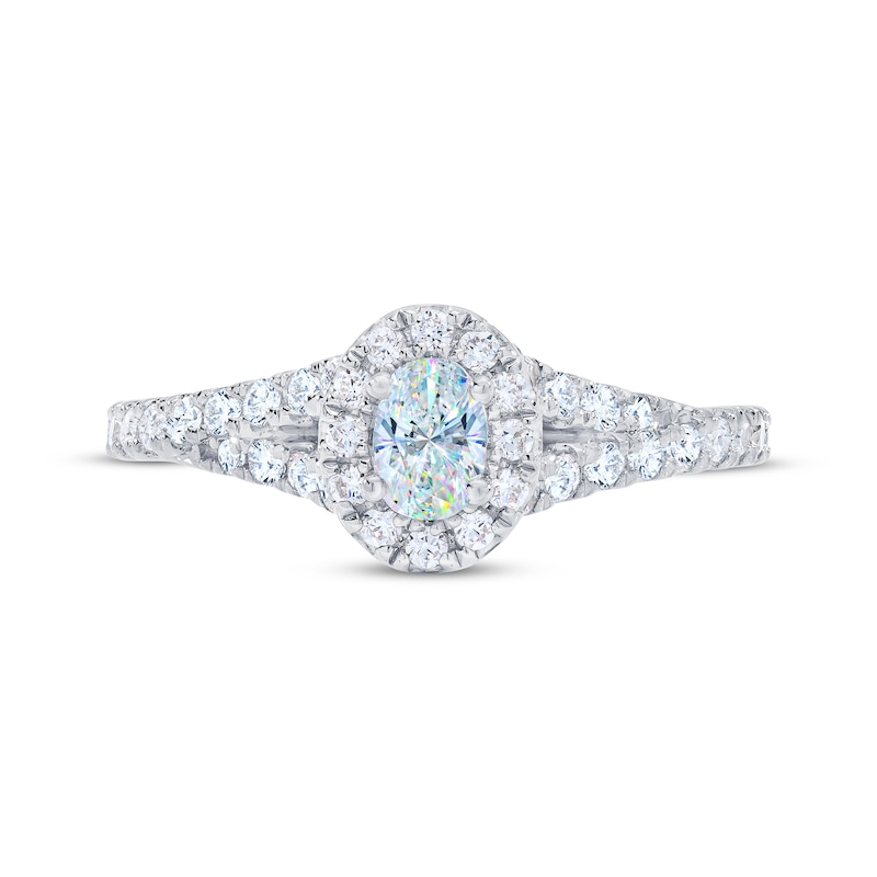 A mesmerizing 1/3-carat oval-cut First Light® diamond is the focal point of this magnificent engagement ring for her. From Leo Schachter, the independently-certified diamond features Fire Prism™ technology that creates infinite flashes of color for more fire and sparkle. Brilliant round diamonds halo the center and shimmer down the split-shank 14K white gold band for a total diamond weight of 3/4 carat. The center diamond is inscribed with a unique Gemscribe® serial number to ensure your peace of mind. Live Your Love in Color.™
