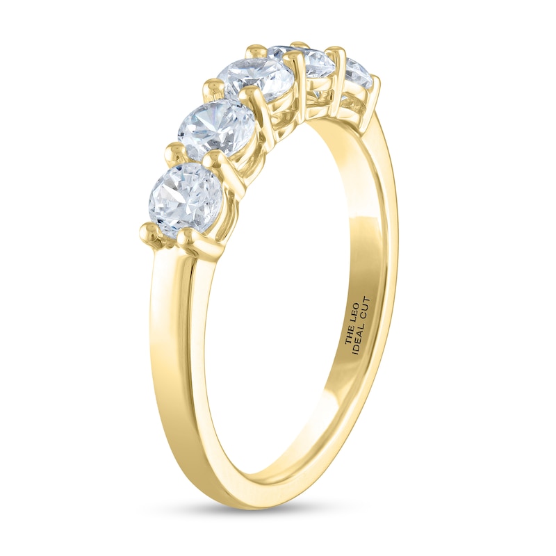 This gorgeous anniversary ring from THE LEO® Ideal Cut Diamond collection features five Ideal Cut Diamonds, which are rare diamonds of geometrically perfect proportions that release the maximum amount of fire, sparkle and brilliance. The chic ring is crafted in iconic 14K yellow gold and boasts a total diamond weight of 1 carat. Each diamond is GSI-certified.