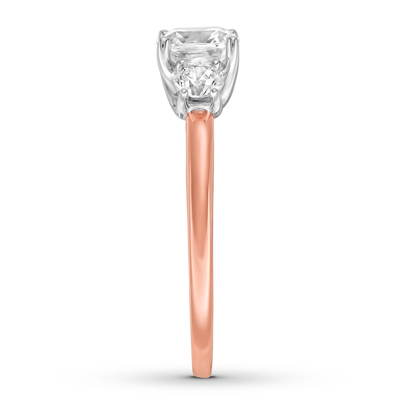 Romantic, elegant, and sparkling, this exquisite three-stone engagement ring displays a dazzling 1-carat cushion-cut diamond bordered on each side by a round diamond. The band is fashioned in lovely 14K rose gold, and the diamonds total 1 1/3 carats in weight. From the Now & Forever® Bridal Collection.