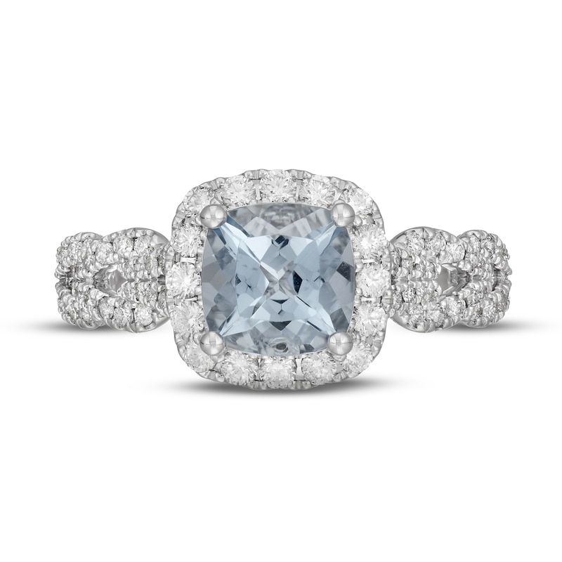 A mesmerizing aquamarine adds a tasteful splash of color to this engagement ring for her. Brilliant round diamonds surround the center and adorn the interweaving band. The ring is crafted in 14K white gold and has a total diamond weight to 5/8 carat. From the Neil Lane Bridal® collection.