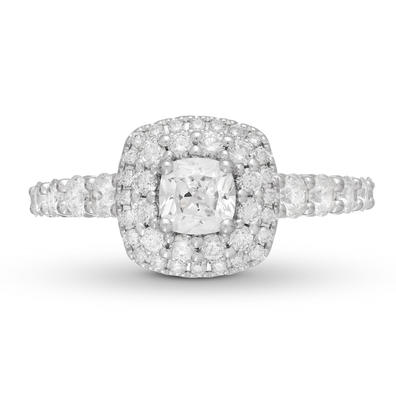 A beautiful 1/2-carat cushion-cut diamond sparkles at the center of this engagement ring for her, haloed by two rows of brilliant round-cut diamonds. More round diamonds shimmer down each side of the 14K white gold band for a total diamond weight of 1 1/2 carats. Milgrain detailing completes the classic look. From the Neil Lane Bridal® collection.