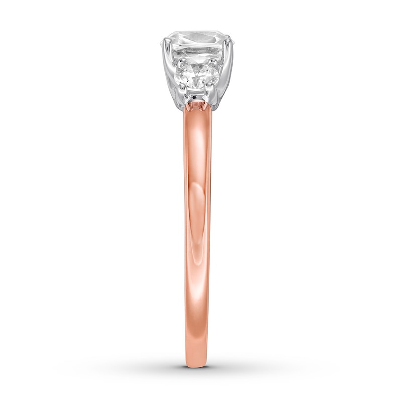 This elegant ring features a 3/4-carat cushion-cut diamond center with a sparkling round diamond on either side set with a flash of white rhodium on the prongs to further enhance its beauty. The 14K rose gold band adds a romantic touch, and the ring has a total diamond weight of 1 carat.