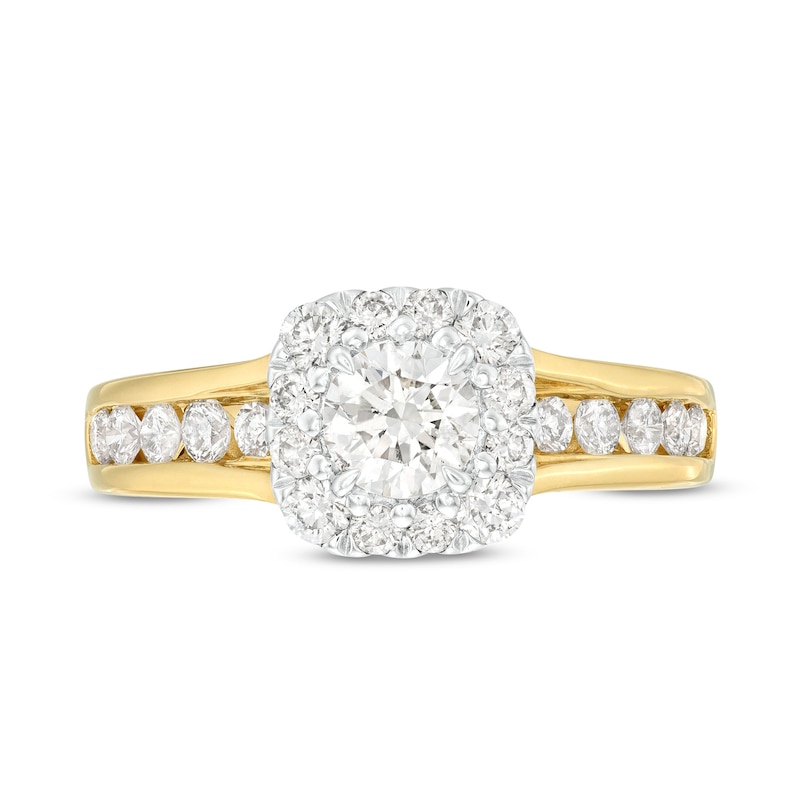 A brilliant 1/2-carat round diamond sparkles at the center of this timeless engagement ring. A beautiful round diamond halo surrounds the center stone, and stunning channel-set round diamonds shimmer down the band for a total diamond weight of 1 3/8 carats. The ring is crafted in classic 14K yellow gold. From the Now & Forever® bridal collection.
