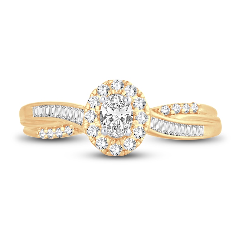 Chic and sophisticated, this engagement ring showcases a beautiful oval-cut diamond at its center, haloed by brilliant round diamonds. Sweeps of baguette-cut and round-cut diamonds shimmer along the band for a total diamond weight of 3/8 carat. The ring is crafted in timeless 14K yellow gold. From the Now & Forever® bridal collection.