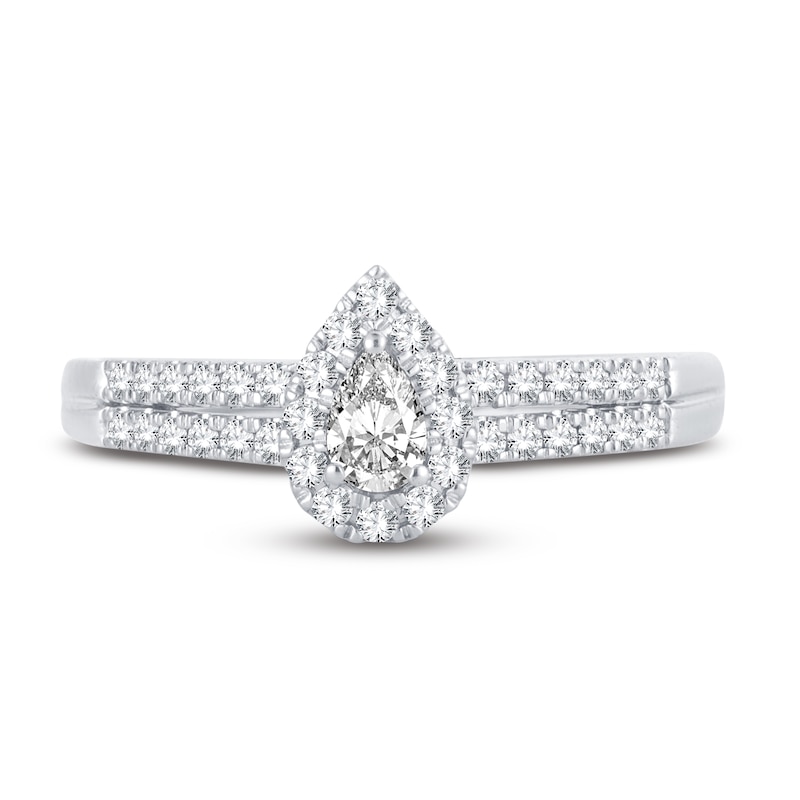 This beautiful engagement ring showcases a stunning pear-shaped diamond at its center, haloed by brilliant round diamonds. More round diamonds gleam down the sides of the band in two rows, giving the ring a total diamond weight of 3/8 carat. The ring is set in iconic 14K white gold. From the Now & Forever® bridal collection.