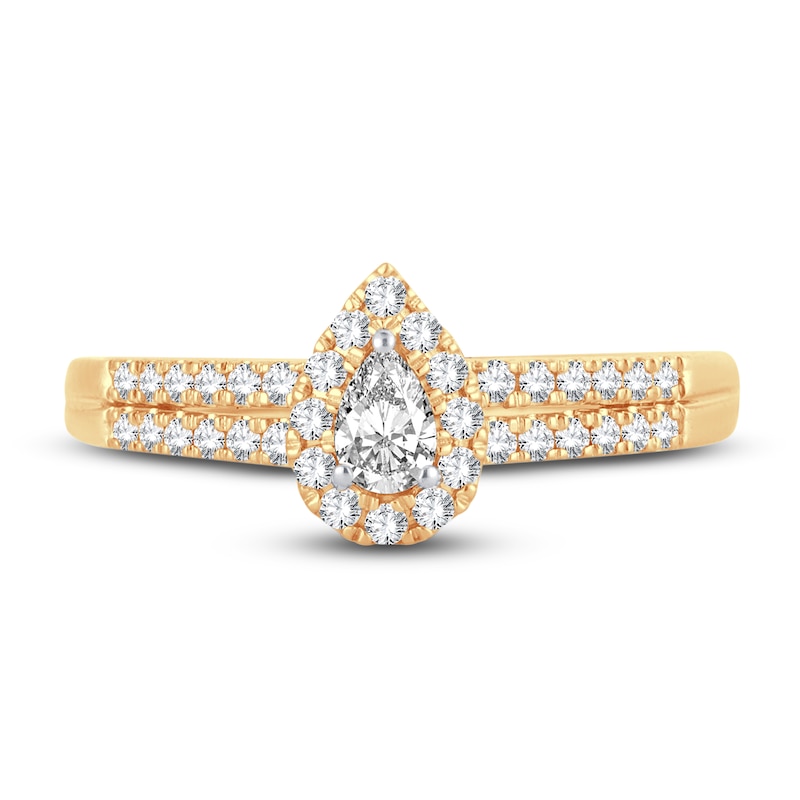 A gorgeous pear-shaped diamond sparkles at the center of this chic engagement ring for her. Set in timeless 14K yellow gold, brilliant round diamonds halo the center stone and shimmer down the band in dual rows. The ring has a total diamond weight of 3/8 carat. From the Now & Forever® bridal collection.
