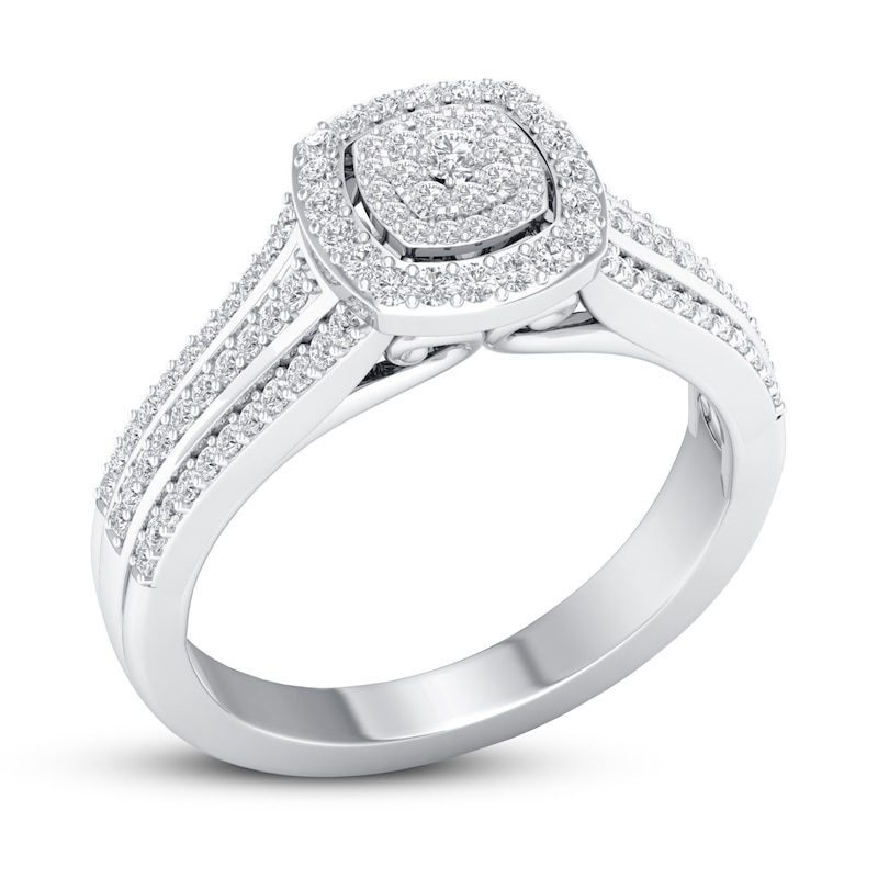 This eye-catching women's engagement ring features dazzling round diamonds forming three rows down each side of the band. Round diamonds form the center of this engagement ring, haloed by more diamonds for a total diamond weight of 3/8 carat. The 10K white gold ring is from the Now & Forever® bridal collection.