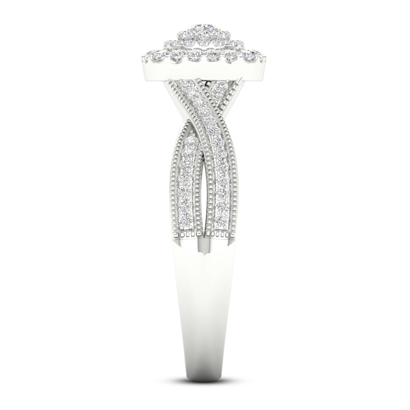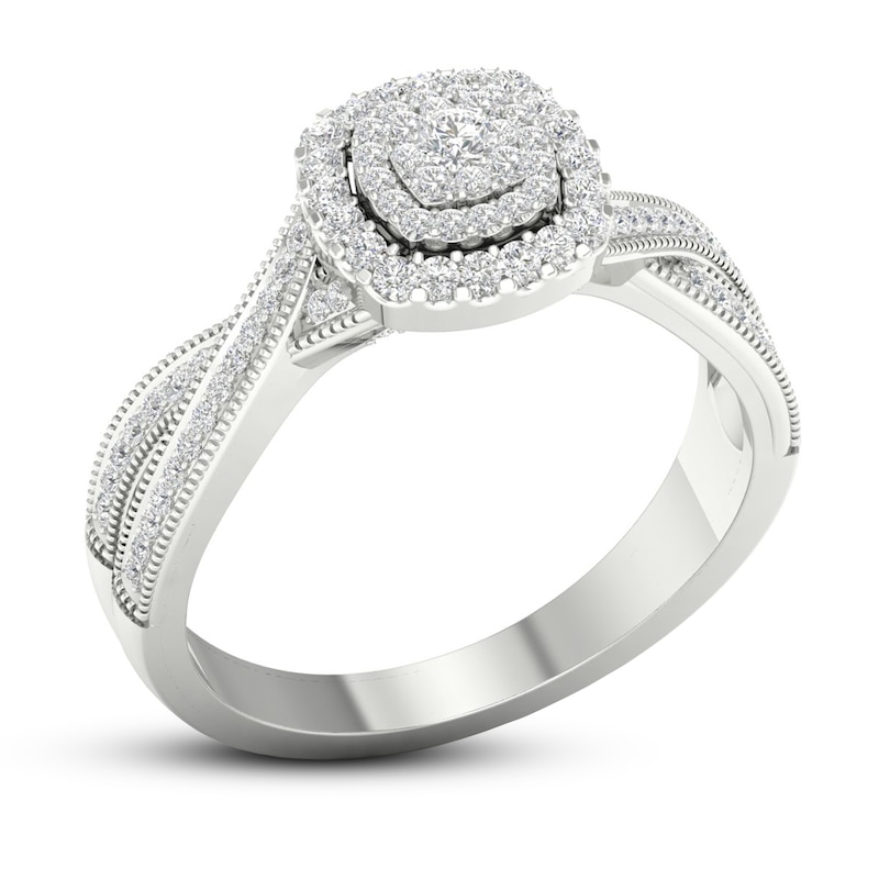 This enchanting diamond engagement ring for her features a beautiful round-cut diamond at its center, framed by multiple gorgeous haloes of more round diamonds. Additional round diamonds sparkle down each side of the twisted band, accented by milgrain detailing. The ring is fashioned in classic 10K white gold and has a total diamond weight of 3/8 carat. From the Now & Forever® bridal collection.