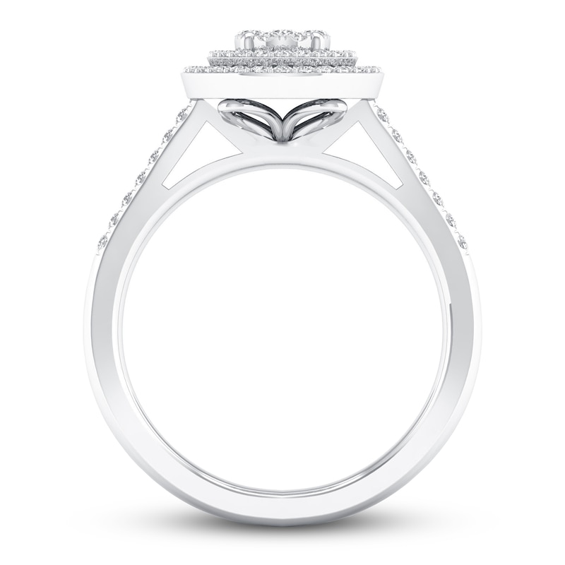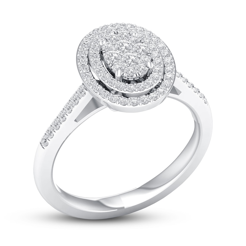 Brilliant round diamonds sparkle throughout this engagement ring's oval design. The center diamonds are haloed by two rows of round diamonds, and additional round diamonds flank down each side of the band. The 10K white gold ring has a total diamond weight of 3/8 carat. From the Now & Forever® bridal collection.