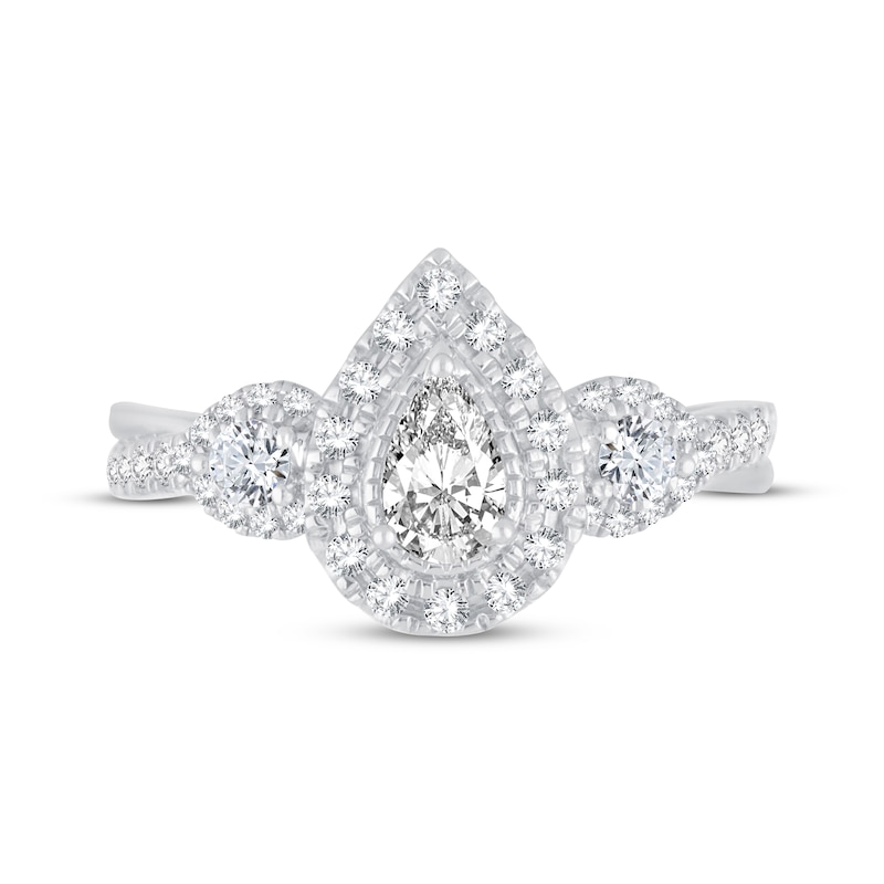 A breathtaking 1/3 carat pear-shaped diamond sparkles at the center of this beautiful engagement and shines even brighter with a stunning pear-shaped halo surround. Two radiant round-cut diamonds flank either side, and a halo of round diamonds frames each center diamond. More round-cut diamonds shimmer down each side of the band, giving the 14K white gold ring a total diamond weight of 7/8 carat. From the Now & Forever® bridal collection.