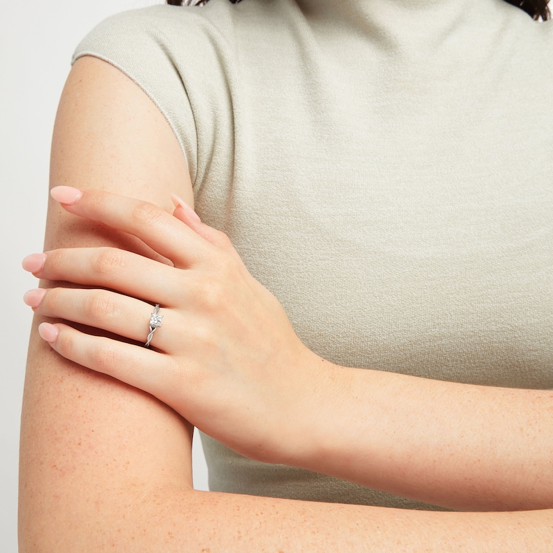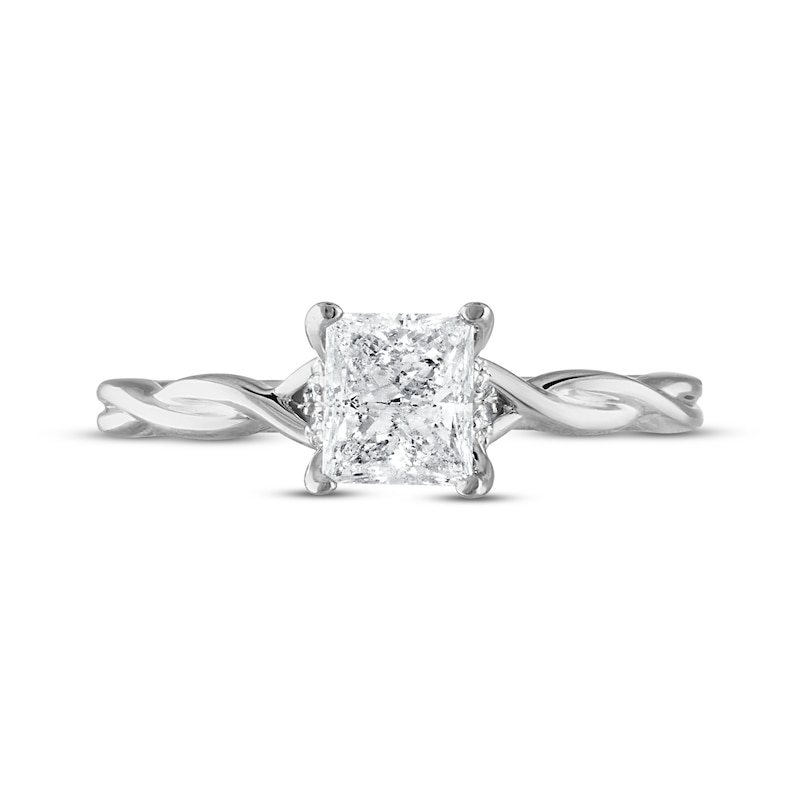 A stunning princess-cut diamond sparkles at the center of this exquisite solitaire engagement ring for her. Sparkling round-cut diamonds peek out under the center diamond for a total diamond weight of 3/4 carat, and the band features a unique twisted design. The ring is set in classic 14K white gold.