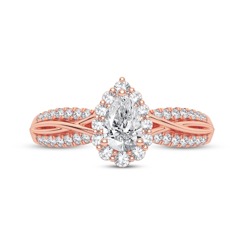 Shimmering with romance, this elegant engagement ring features a bright pear-shaped diamond embraced by a halo of radiant round-cut diamonds. Two sparkling bands of round-cut diamonds interweave throughout the gracefully twisting silhouette for a total diamond weight of 3/8 carat. Crafted in 14K rose gold, the ring is featured in our Now & Forever® bridal collection.