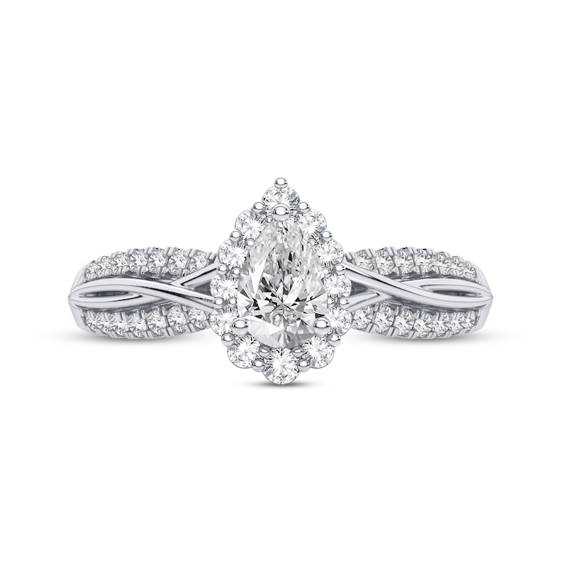 Shimmering with romance, this elegant engagement ring features a bright pear-shaped diamond embraced by a halo of radiant round-cut diamonds. Two sparkling bands of round-cut diamonds interweave throughout the gracefully twisting silhouette for a total diamond weight of 3/8 carat. Crafted in 14K white gold, the ring is featured in our Now & Forever® bridal collection.